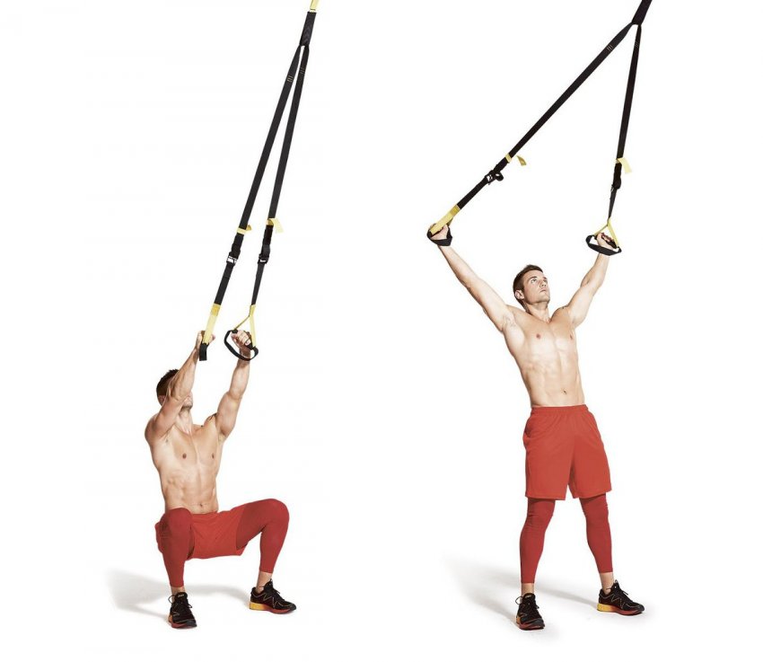 Ухватитесь за ручки и присядьте, позволяя TRX принять на себя ваш вес. Встаньте, разводя руки в стороны при подъеме, чтобы проработать задние дельты и верхнюю часть спины. Поддерживайте ремни в напряжении на протяжении всего набора повторений.