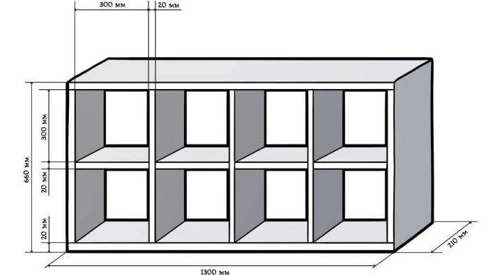 Схема стеллажа довольно простая. Нужно вырезать из картона достаточное количество деталей, чтобы собрать стеллаж по схеме ниже.