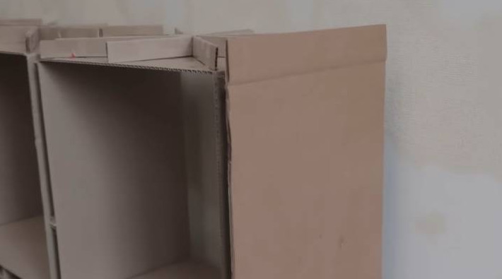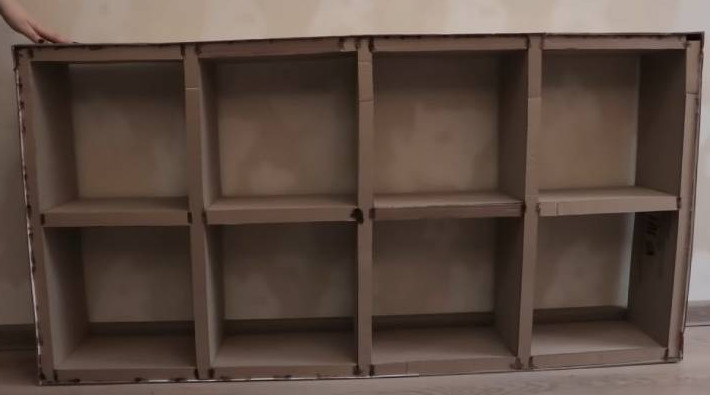 Конечно, необходимо дополнительно укрепить стенки стеллажа, чтобы на них можно было что-то положить. Для этого нарастите толщину стенок перемычками из картона.