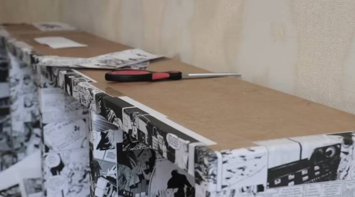Выберите, чем украсить стеллаж: салфетками в технике декупаж, самоклеящейся плёнкой, остатками обоев или даже распечатанными на принтере картинками.