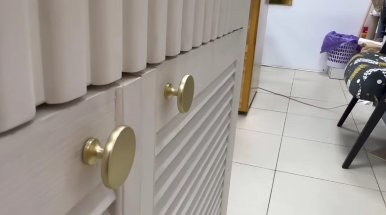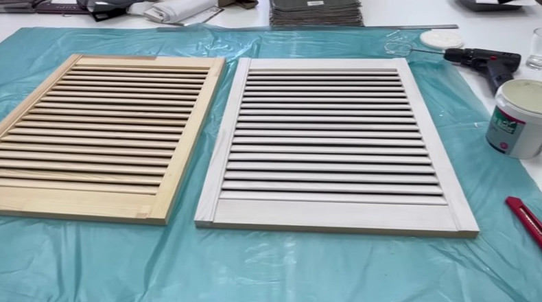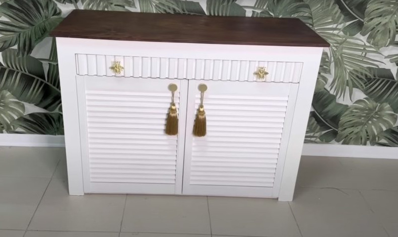 Чтобы тумба была более функциональной, дополните ее дверцами. Для изготовления дверец используйте деревянные жалюзи, которые можно купить в строительном магазине. Покройте жалюзи краской и оставьте до полного высыхания.
