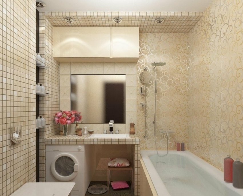 Самое компактное расположение стиральной машины в маленькой ванной — под специальной накладной для раковины, подвод к коммуникациям у которой находится у стены за стиральной машиной. Такое решение позволит максимально грамотно использовать имеющееся пространство.