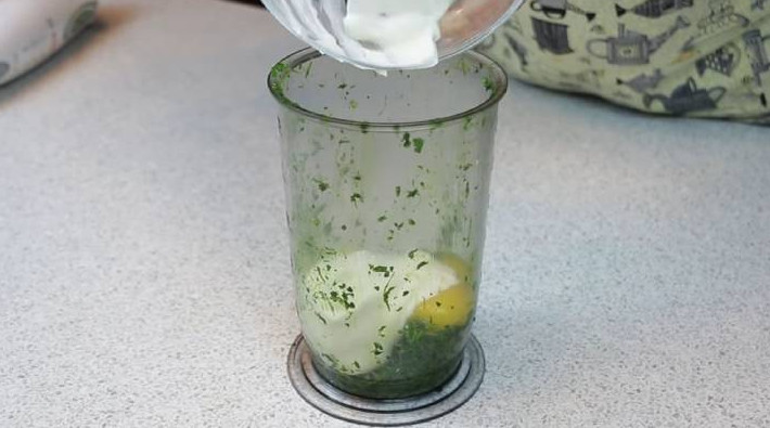 1. Отделите белки от желтков. Желтки добавьте к шпинату (зелени петрушки без «хвостиков»), сюда же — сметану, растительное масло, соль. Погружным или обычным блендером измельчите до однородного состояния.