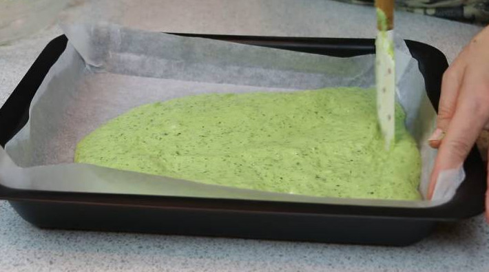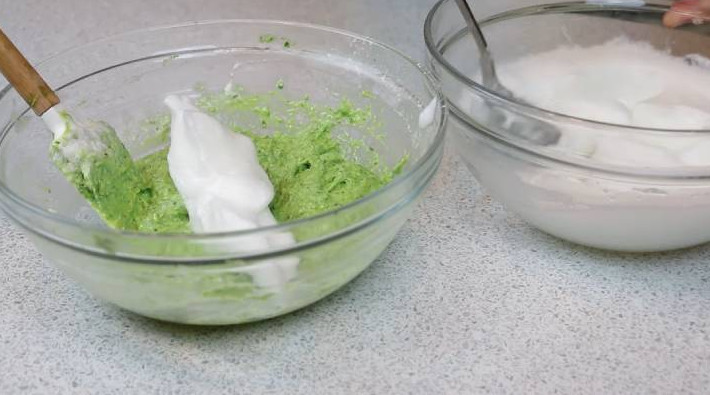 3. Муку с разрыхлителем отправьте в зелёной массе, перемешайте. Постепенно добавляйте взбитые белки, перемешивайте.