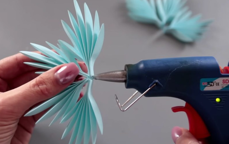 Минимальное количество сегментов для изготовления снежинки — 6 штук. Однако снежинки с 7-8 сегментами будут смотреться красивее. Склейте сегменты между собой.