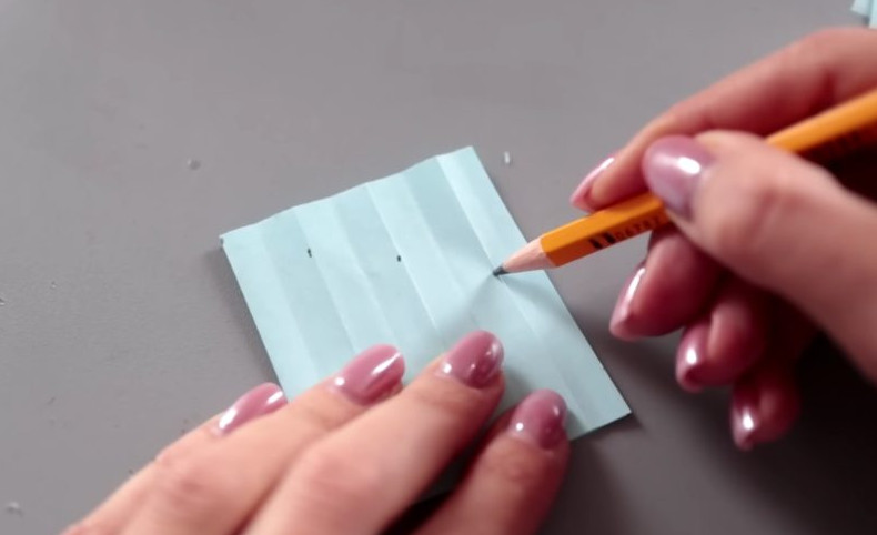 На сложенной пополам заготовке сделайте разметку: каждая точка должна быть ниже предыдущей на 0,7 мм. Данные точки являются вершинами снежинки.