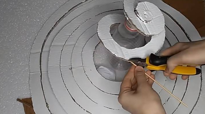 В каждую секцию картонной спирали вставьте шпажки. Это своеобразное ребро жёсткости будущей ёлки.