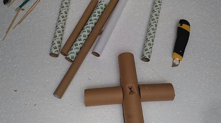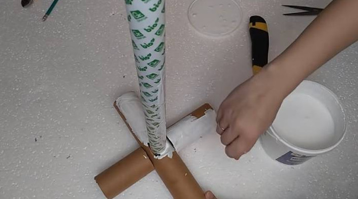 Из втулок соберите крестовину и основание ёлки. Втулки можно использовать самые разные: от стрейч-плёнки, бумажных полотенец, фольги и т. д.