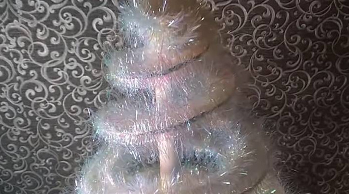 К картону приклейте мишуру. Сверху добавьте гирлянду.