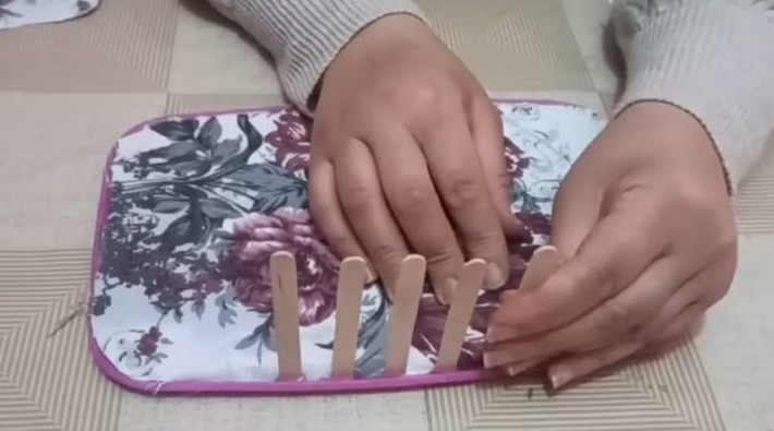 Крышку оклейте с обеих сторон красивой тканью. В углубление по краю добавьте немного клея из пистолета и вставьте деревянные палочки для мороженого. Старайтесь расставлять их на равном расстоянии друг от друга.