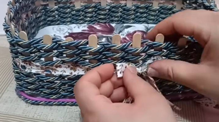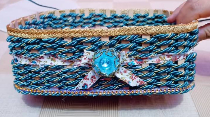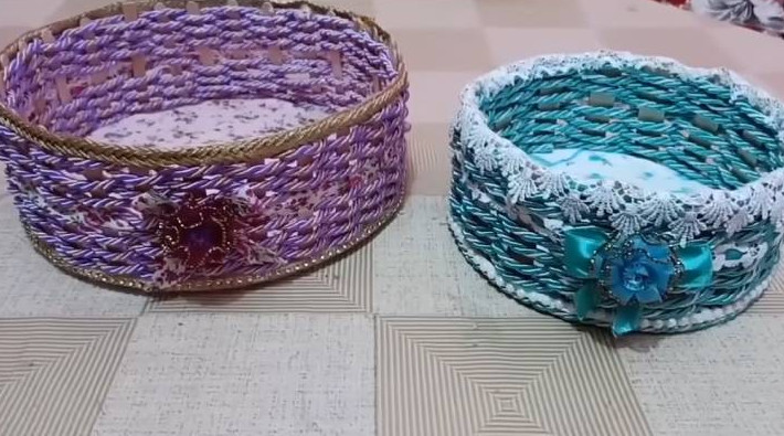 По желанию украсьте готовую корзинку декоративной тесьмой и стразами. Органайзер получится разной формы, если взять круглую, квадратную или прямоугольную крышку!