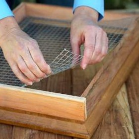 - На рамку прикрепить сетку, закрепив края степлером или гвоздями. Поместить внутрь агроволокно, которое вырезано по размеру. Прикрепить его к краям рамки.