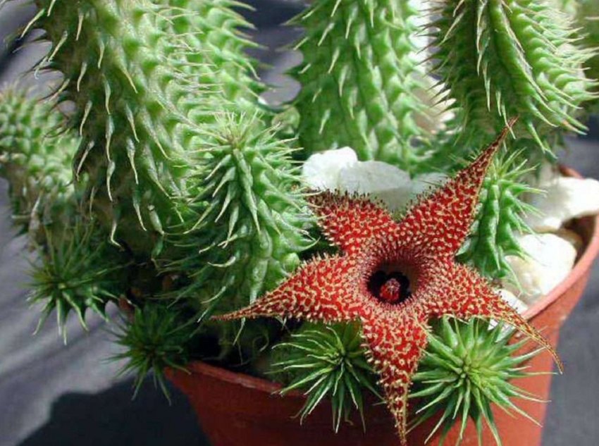 Это комнатное растение украшает пейзажи дикой природы в Южной Африке. Красивые цветы и причудливые стебли – это те качества, которые привлекают цветоводов. Но сами цветы – привлекаю мух своим неприятным запахом. Не рекомендуется держать это растение в спальне, детской, тесных помещениях.