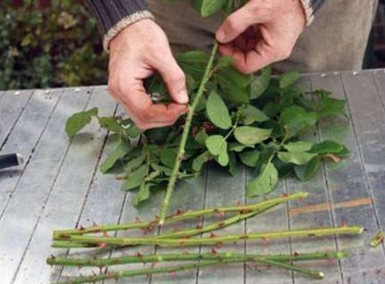 • Черенок длиной 15-20 см вырезаем из центральной части розы, делая косые надрезы. Он должен обязательно иметь на себе хотя бы три почки.