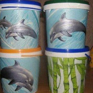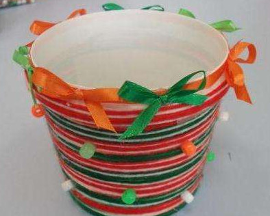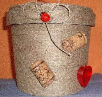 Для получения интересного сундучка для мелких вещей, семян, фруктов можно обезжирить пластиковое ведерко, нанести слой клея ПВА и обмотать толстой веревкой любой расцветки. Продолжить декорирование ведра можно по своему вкусу, используя ленточки, бусинки, бисер, пуговички или любые другие материалы. Примеры таких поделок показаны на фото.