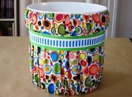 Майонезное ведерко можно просто обернуть красивой тканью, и получится оригинальный вазон. Но не стоит забывать, что под открытое небо такие поделки выставлять не стоит.