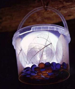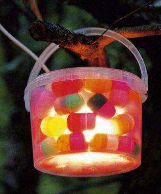 Для изготовления небольших плафонов для лампочки в саду подойдут исключительно прозрачные майонезные ведерки. Эффектно будет выглядеть, если их оклеить разноцветными стекляшками или оформить в виде гербария. В принципе, удачное оформление такого плафона – результат хорошего вкуса и воображения. Если в них нет недостатка, такой осветительный прибор может выглядеть весьма симпатично. Прослужит он вам достаточно долго, так как пластик не боится ни снега, ни ветра, ни дождя. Если же ведерко потускнеет, то после поедания очередной порции майонеза можно сделать новый практически бесплатный экземпляр.