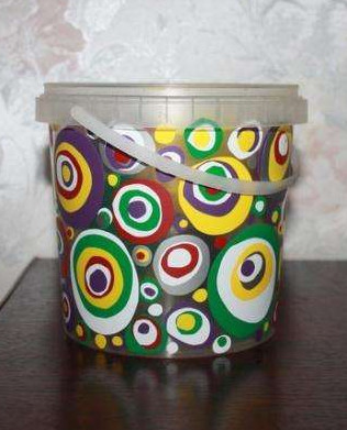 Самый простой вариант – окрасить ведерко яркими красками и нанести какой-нибудь орнамент. Например, можно нарисовать аккуратненькие кружочки контрастирующего цвета.Если хватает таланта, можно нарисовать фигурки или картинки, придуманные самостоятельно. Еще один вариант оформления майонезного ведерка под кашпо или садовую емкость – приклеивание кусочков красочной самоклейки. Самоклеящийся материал различных цветов нарезают кружочками, квадратами или любыми другими формами и в хаотичном порядке клеят на поверхность ведра. Пример такого оформления представлен на фото.