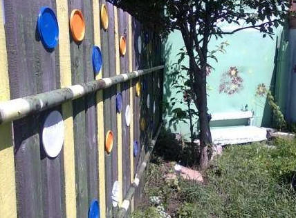 Садоводы с особенными творческими наклонностями сообразили, что в качестве декора применимы и крышечки пластиковых ведер с-под майонеза. Ними украшают забор или фасад здания. Не помешает окраска в яркие подходящие цвета. Вот как это может выглядеть.