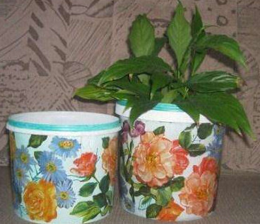 Наиболее актуально использование майонезных ведерок для изготовления нарядных цветочных горшков или емкостей для мелких садовых принадлежностей, семян или фруктов. Их можно подвесит на любую постройку сада или поставить на террасе или под открытым небом. В зависимости от того, будут ли они находиться под укрытием или вне его, подбирается подходящий материал для оформления.