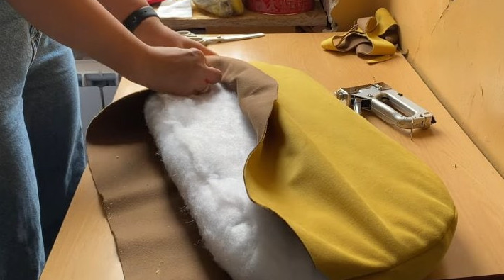 Обтяните заготовки синтепоном. Подберите хорошую ткань (в МК — велюр). Вырежьте с запасом обтяните и зафиксируйте мебельным степлером.