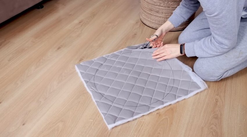 Последний шаг — изготовление декоративного чехла из выбранной ткани. Декоративный чехол шьется точно так же, как и внутренний. По нижней части декоративного чехла сделайте кулиску и вставьте в нее резинку, так чехол будет аккуратно закреплен на основании.