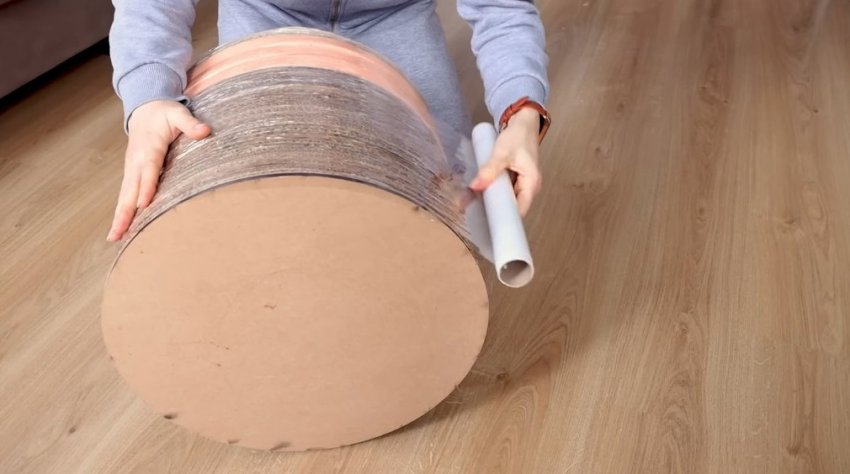 Для того чтобы чехол было легче одевать, а синтепон не цеплялся за картон, оберните основание пуфика пищевой пленкой.