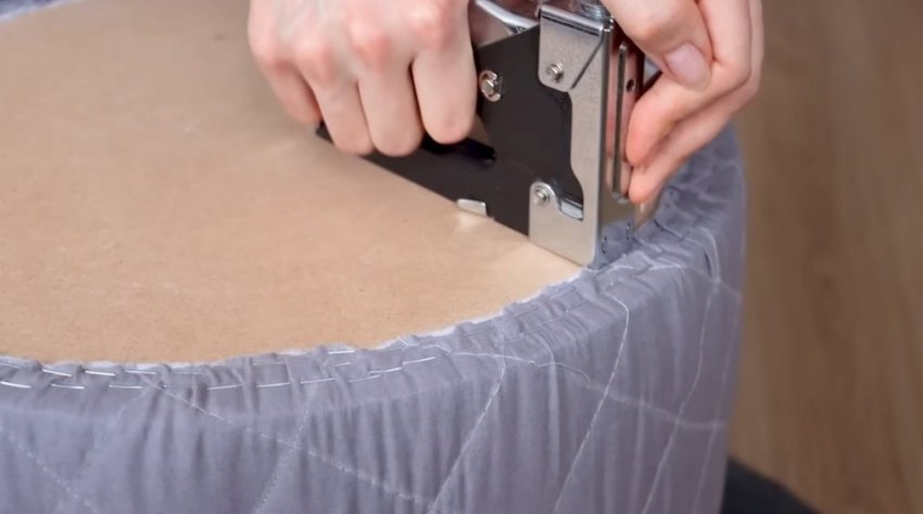 Соедините две детали чехла и сострочите их, чтобы получить цельный чехол. Обрежьте припуски на швы максимально близко к строчке, чтобы излишки ткани на чехле не топорщились. Зафиксируйте чехол на основании с помощью степлера.