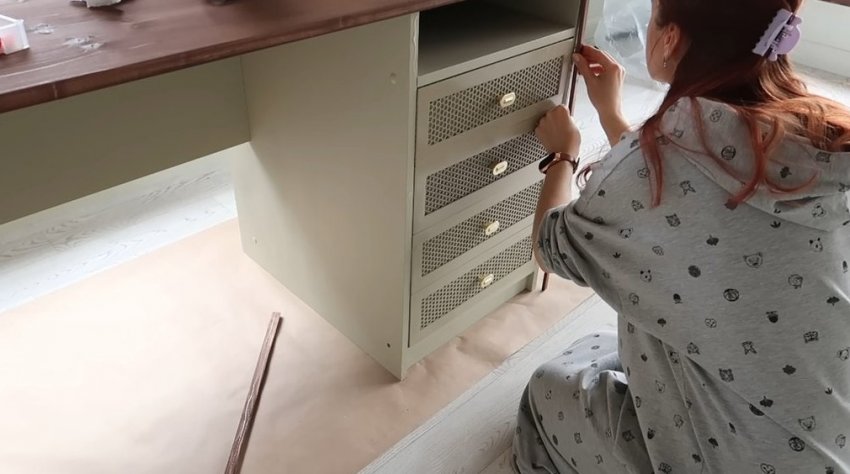 Для того чтобы дизайн стола был более завершенным, по обе стороны от фасадов выдвижных ящиков приклейте деревянную раскладку, затонированную в цвет столешницы.
