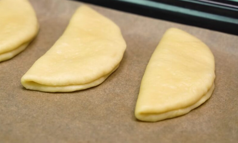 Готовое тесто разделите на 15 равных частей. Из каждой части скатайте шарик. Оставьте заготовки на столе под пленкой на 10-15 минут. Каждый шарик теста раскатайте скалкой в круглую заготовку. Сложите заготовки пополам и выложите на противень, выстеленный пергаментной бумагой.