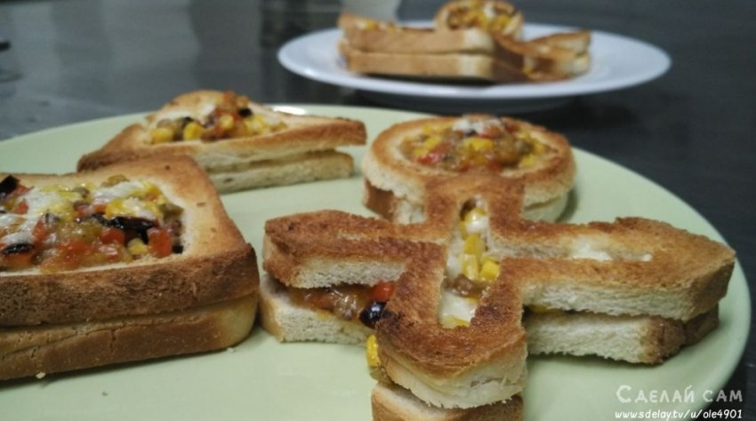 Из хлеба вырезаем геометрические фигуры оставляя место под начинку.