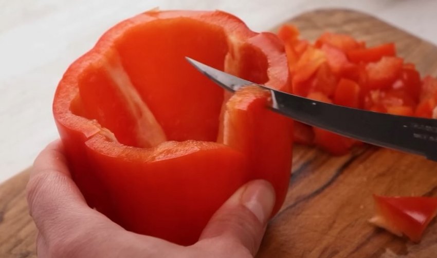 Срежьте крышечку перцев. Оставшийся на крышечке перец нарежьте кубиком.
