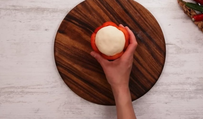 Заверните начинку в тесто и поместите заготовку в болгарский перец.