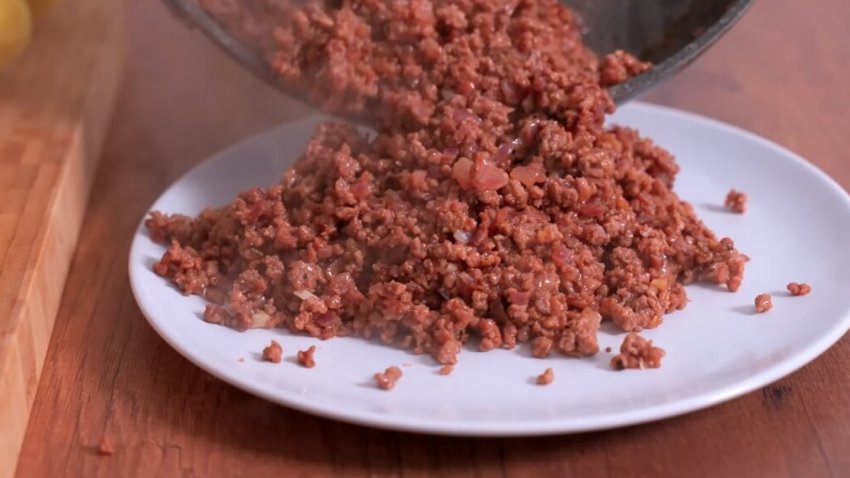 Обжарьте на растительном масле мелко нарезанный лук с фаршем до полной готовности. Добавьте к фаршу 2 измельченных зубчика чеснока, соевый соус, специи и кетчуп и хорошо перемешайте. Готовую начинку выложите на блюдо.