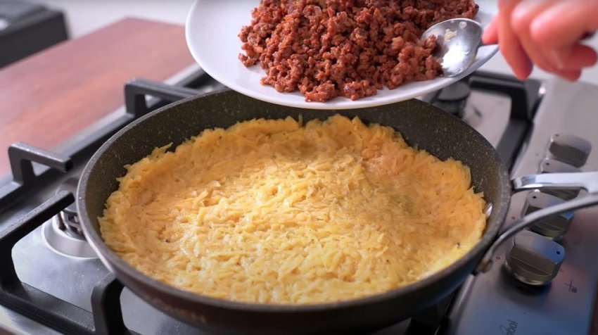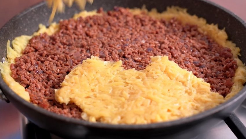 Очень вкусные блюда для всей семьи можно приготовить из самых простых и бюджетных продуктов. Отличный вариант обеда или ужина — королевский драник с начинкой из мясного фарша. Блюдо готовится очень просто, получается очень сытным, а его вкус по достоинству оценят все члены семьи. Alina FooDee/youtube Для приготовления понадобится: картофель — 900 г; яйцо — 2 шт; лук — 1 шт; чеснок — 2 зубчика; соевый соус — 2 ст.л; соль, черный молотый перец, кориандр — по вкусу; фарш — 500 г; кетчуп — 2 ст.л; сливочное масло — 1 ст.л. Обжарьте на растительном масле мелко нарезанный лук с фаршем до полной готовности. Добавьте к фаршу 2 измельченных зубчика чеснока, соевый соус, специи и кетчуп и хорошо перемешайте. Готовую начинку выложите на блюдо. Alina FooDee/youtube На крупной терке натрите сырой картофель. Отожмите картофель от сока. Alina FooDee/youtube Добавьте к картофелю яйца, соль и перец по вкусу. На раскаленной сковороде растопите кусочек сливочного масла. Выложите на сковороду половину картофельной массы. Равномерно распределите картофельную массу по сковороде и сформируйте небольшой бортик. Выложите на картофель мясную начинку. Alina FooDee/youtube Сверху на начинку выложите вторую часть картофельной массы. Alina FooDee/youtube Накройте сковороду крышкой и готовьте драник на медленном огне 20-25 минут. С помощью тарелки переверните блюдо и обжаривайте его со второй стороны еще 12-15 минут. Накрывать сковороду крышкой не надо. Alina FooDee/youtube Перед подачей блюдо можно смазать сметаной и посыпать зеленью. Королевский драник по достоинству оценит каждый. Alina FooDee/youtube Пошаговый рецепт приготовления королевского драника смотрите на видео: