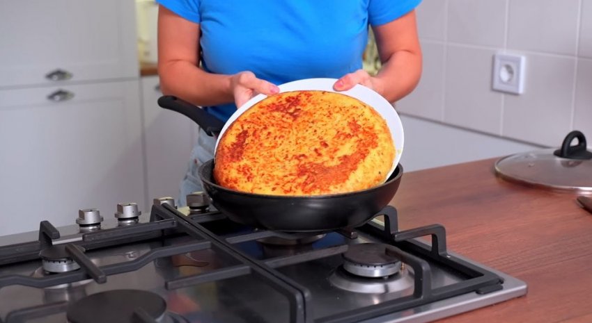 С помощью тарелки переверните блюдо и обжаривайте его со второй стороны еще 12-15 минут. Накрывать сковороду крышкой не надо.