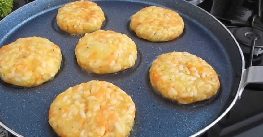 Мелко нарезанный лук и тертую морковь обжарьте на небольшом количестве растительного масла. Добавьте обжаренные овощи, яйцо и специи к картофелю и рису и хорошо перемешайте.