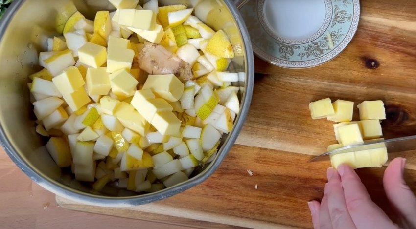 Мелко нарежьте спелые груши, добавьте к ним кленовый сироп, сок половины лимона, кусочек имбиря и сливочное масло.