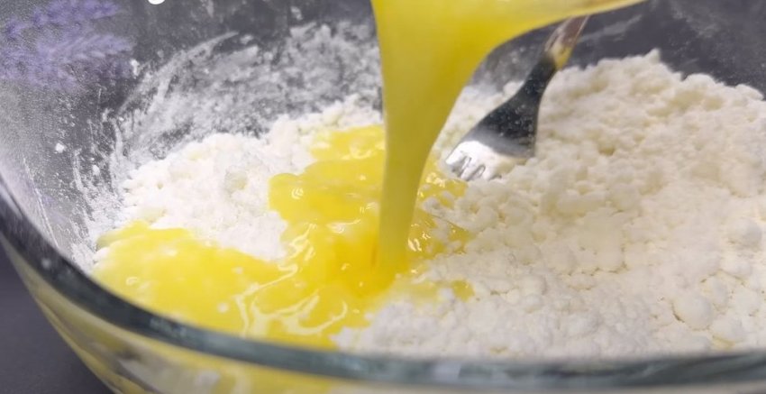 Смешайте творог, соль, подсластитель, пищевую соду и просеянную муку. К творожной массе добавьте растопленное сливочное масло.