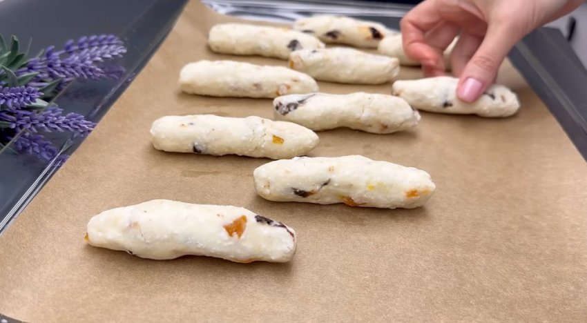 Добавьте нарезанные сухофрукты и сформируйте печенье. Выложите заготовки на противень, застеленный пергаментной бумагой, и выпекайте в предварительно разогретой духовке при 180°C 20-25 минут.