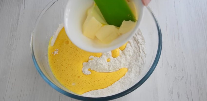 Соедините влажные ингредиенты с сухими и размягченным сливочным маслом. Замесите однородное, мягкое тесто, которое будет иметь липкую консистенцию. Накройте тесто пищевой пленкой и оставьте в холодильнике минимум на 2 часа.