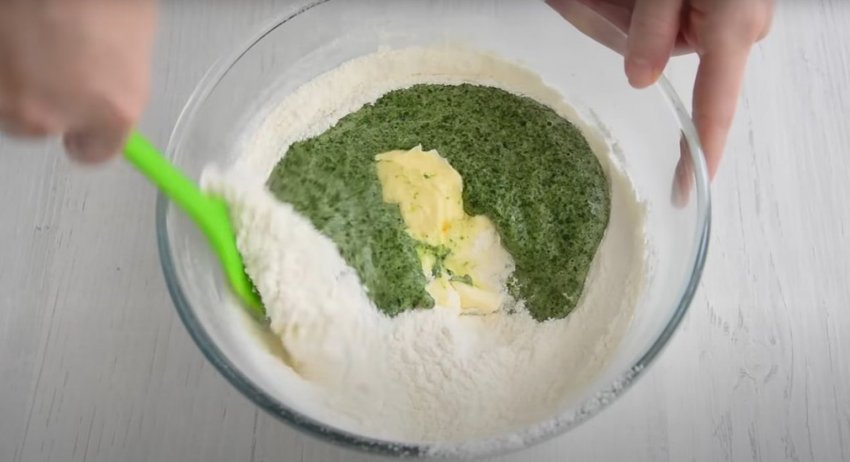 Для приготовления теста для мятного печенья также необходимо в отдельной емкости соединить все сухие ингредиенты. В отдельной емкости пробейте погружным блендером яйцо, листочки мяты без стеблей и шпинат, который придаст тесту красивый зеленый цвет.