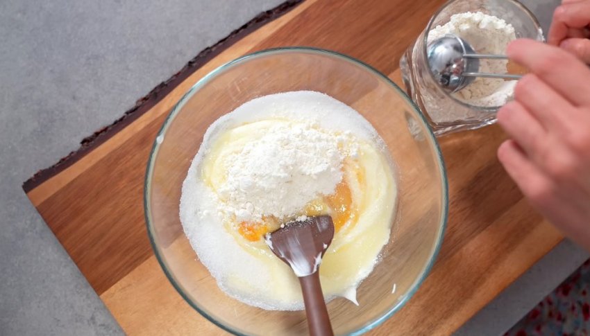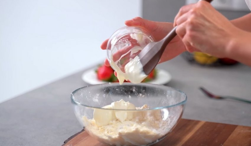 Переложите тесто на пищевую пленку или пергамент и оставьте в холодильнике на 30 минут. Заливка для пирога готовится очень просто. Все, что нужно сделать — просто смешать все ингредиенты до получения однородной массы.