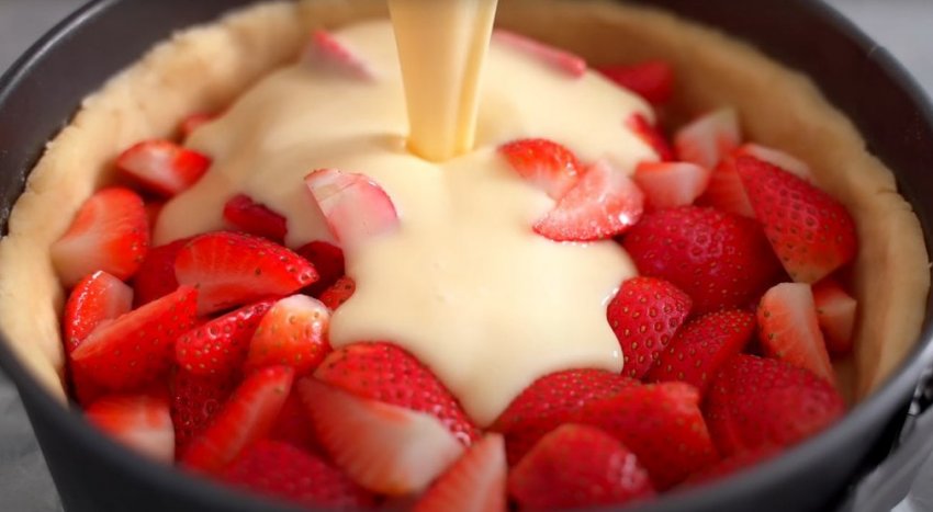 Раскатайте песочное тесто и переложите его в разъемную форму, застеленную пергаментной бумагой. Сформируйте бортики высотой 3,5-4 см. Выложите на тесто нарезанную клубнику и залейте сметанной заливкой.