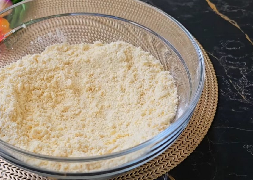 Соедините муку с разрыхлителем, добавьте холодное сливочное масло, нарезанное небольшими кусочками. Перетрите масло с мукой, чтобы получить рассыпчатую крошку.