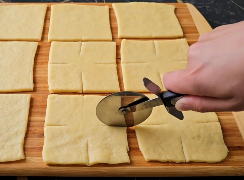 Раскатайте охлажденное тесто в тонкий пласт и разрежьте на 9 одинаковых квадратов. Каждый квадрат надрежьте в четырех местах.