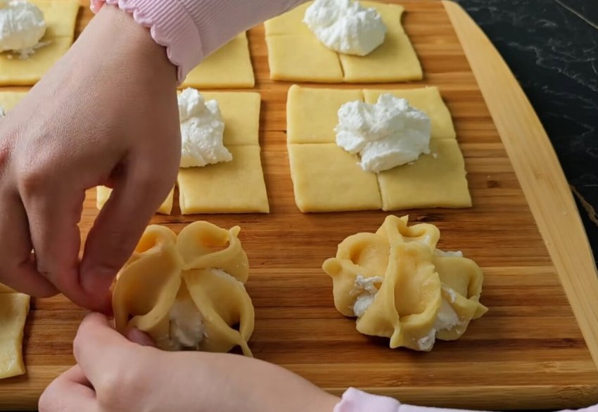 Выложите творожную начинку на центр квадратных заготовок и сформуйте красивое печенье, аккуратно защипывая края в форме лепестков.