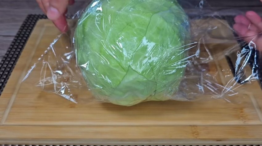 Заверните капусту в пищевую пленку и поместите в микроволновку на 15-20 минут в зависимости от размеров кочана.