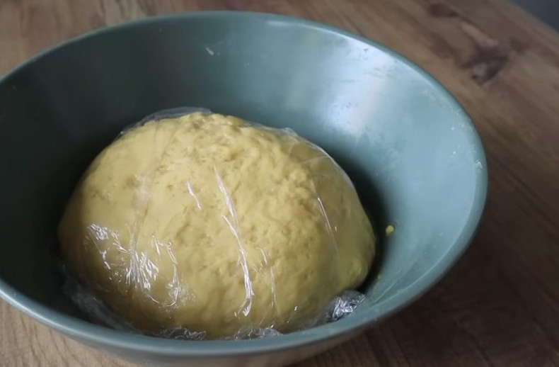 Частями введите просеянную муку и замесите однородное упругое тесто. Если в процессе работы тесто сильно прилипает к рукам, используйте небольшое количество растительного масла. Накройте тесто пленкой и оставьте в теплом месте на час. За это время оно увеличится в объеме в несколько раз.