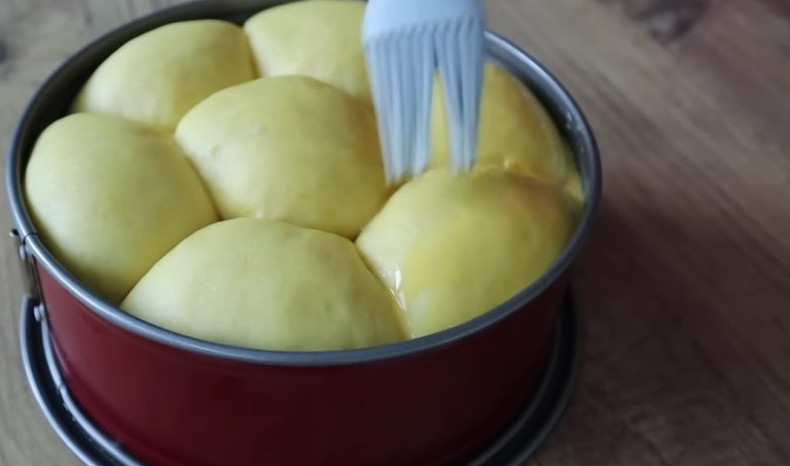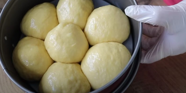 Разделите тесто на 8 равных частей, из каждой части сформуйте аккуратный шарик. Выложите подготовленные шарики в разъемную форму, смазанную растительным маслом, накройте полотенцем и оставьте в теплом месте еще на 25 минут.